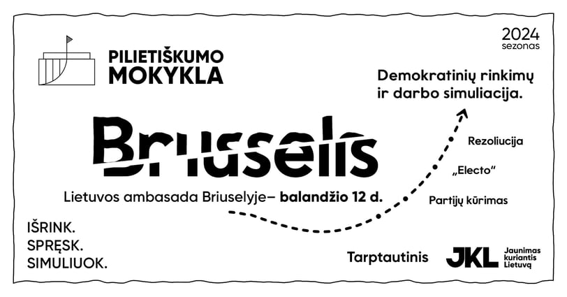 Jaunųjų konservatorių lyga ( JKL ) su dideliu džiugesiu ir nekantrumu pristato daugiametį projektą, pirmą kartą vyksiantį Belgijoje: „Pilietiškumo mokykla 2024: Briuselis“. Renginio metu turėsite galimybę sudalyvauti savivaldybės darbo simuliacijoje, rinkti, o gal net ir tapti meru! Turėsite šansą ne tik plėsti savo žinias apie Lietuvos savivaldą, bet ir pabendrauti su politikais, užmegzti naujų pažinčių, susitikti bendraminčiais, prasmingai bei linksmai praleisti penktadienio vakarą!